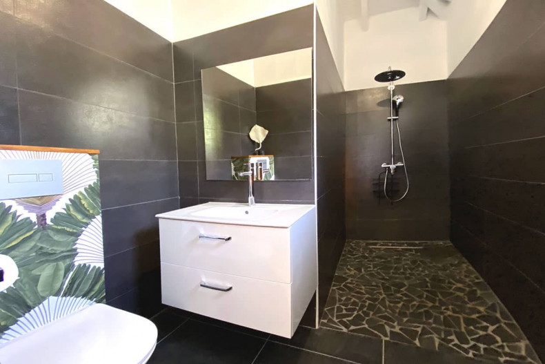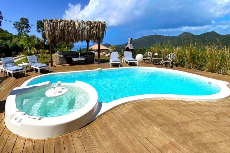 5 independent rooms with all a shower room, you will also appreciate the swimming pool of 8 x 4 secured by alarm and its SPA, its carbet and the view on the sea.