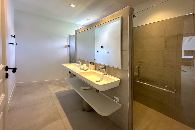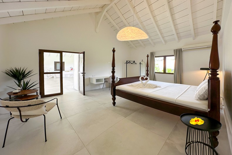 This villa combines traditional architecture, modern comforts and chic Creole decor. Each room is elegantly decorated, offering a warm and refined atmosphere. The master suite, with its sea view and terrace, is equipped with a 160x200 bed, a bathroom with walk-in shower and separate toilet. The second suite, open to the tropical vegetation, offers a 180x200 bed, a desk and a shower room with WC. The family room, on the garden side, includes a 160x200 bed, two bunk beds and a single bed, perfect for accommodating five people.
