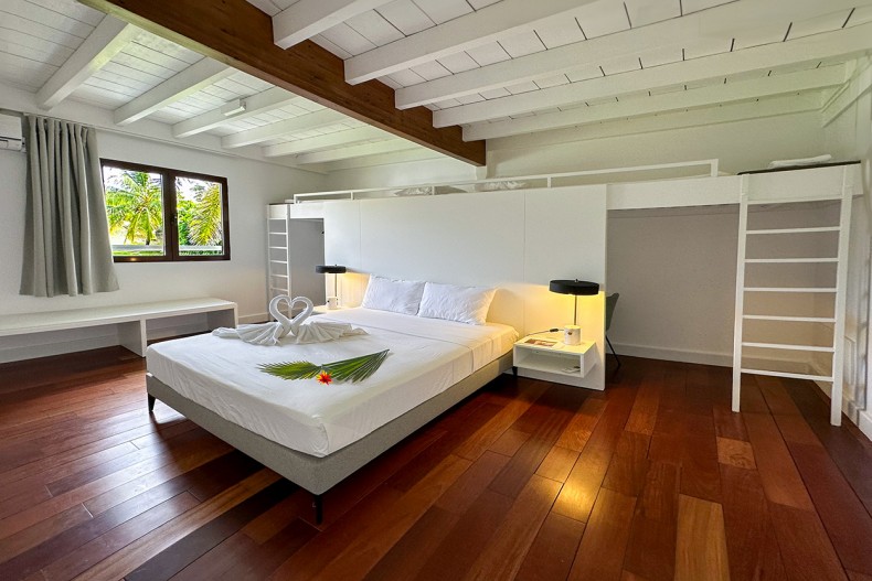 The fourth bedroom, with its colonnaded bed, shares a shower room with two showers and two basins with the family room. Two further beds are available on the mezzanine.
