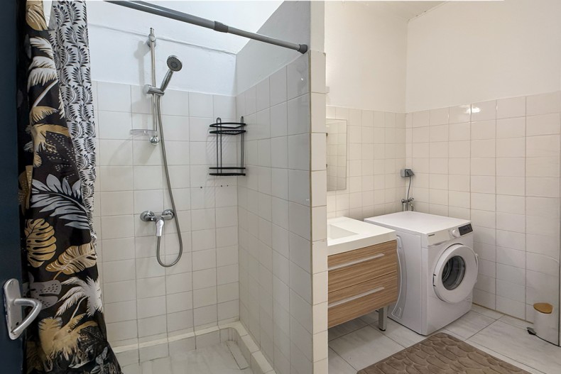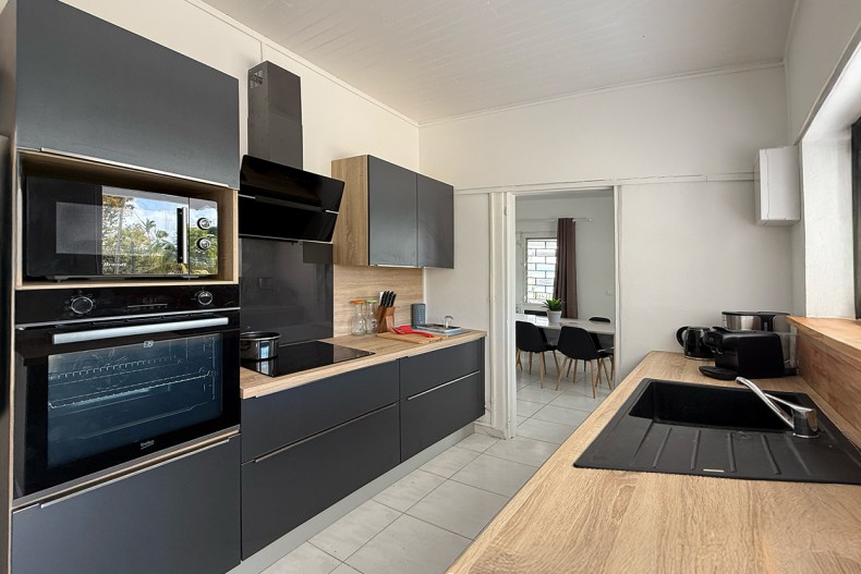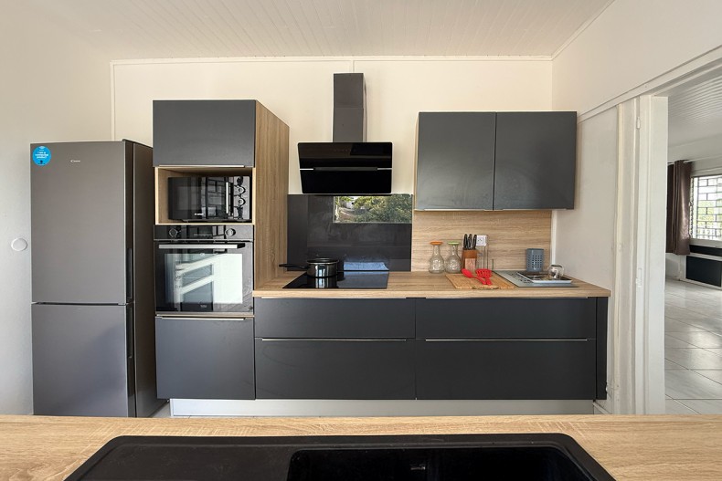 A modern, fully equipped kitchen: oven, microwave, stovetop, large fridge, full set of dishes… everything you need to cook just like at home.