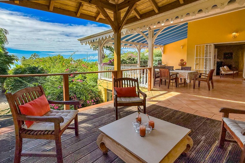 Mention spéciale au jardin fleuri et à l ' immense varangue avec la mer en toile de fond