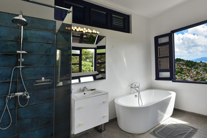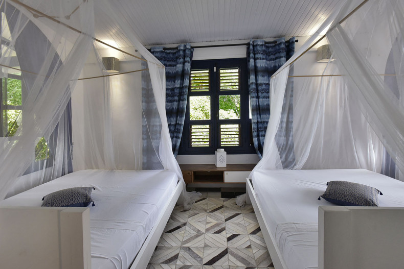 La SUITE AMBASSADRICE profite d'une belle vue sur la mer et sur Fort de France, elle comprenant: une chambre équipée d'un lit à baldaquin, un canapé un espace bureau, un deuxième espace avec 2 lits doubles une salle de bain avec douche, biagnoire, vasque et WC et une terrasse privée