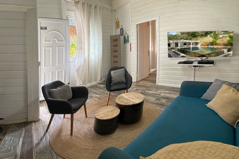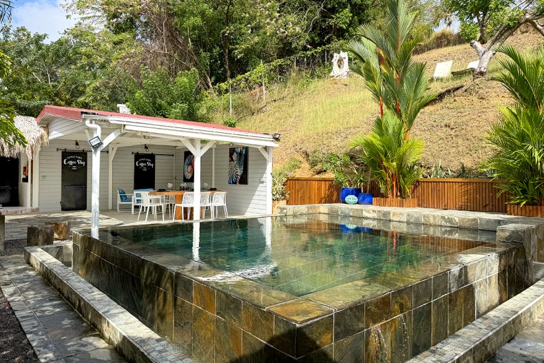 L’extérieur séduit instantanément avec sa piscine à débordement (5 x 4,5 m) habillée de pierre naturelle de Bali, véritable pièce maîtresse du lieu. Autour, un petit jardin soigné à l’ambiance zen, et surtout un grand carbet aménagé avec des beds, parfait pour rêvasser, lire ou simplement laisser passer le temps.