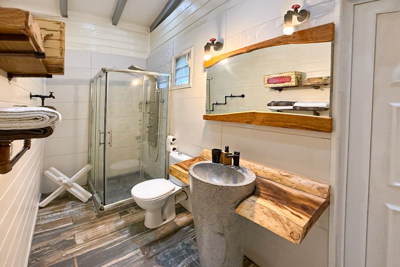 Les deux chambres partagent une salle d’eau avec cabine de douche, vasque et WC.