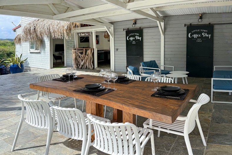 La grande terrasse, pensée comme une vraie salle à manger extérieure, prolonge naturellement les moments de partage. Elle dispose d’une douche extérieure, d’un WC indépendant et se prolonge vers un espace intérieur décoré avec beaucoup de goût, chaleureux et accueillant. Un endroit où l’on se sent bien, immédiatement.