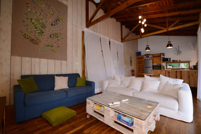 La villa compte deux chambres climatisées, 1 mezzanine couchette idéale pour les ado (échelle de meunier), 1 salle de bain avec water closet, 1 douche extérieure, une cuisine américaine entièrement équipée et un séjour, le tout s’ouvrant sur une terrasse couverte et le jardin de la Palmeraie.