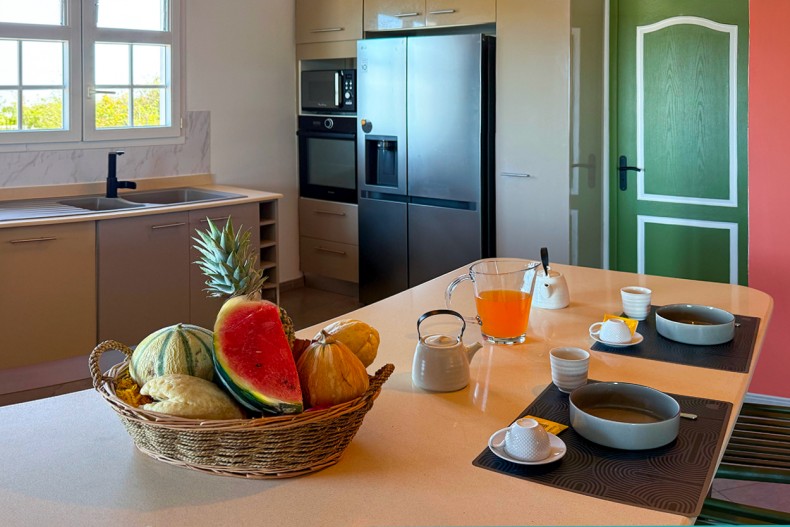 La cuisine avec comptoir en L et bar américain est entièrement équipée pour les séjours en famille :