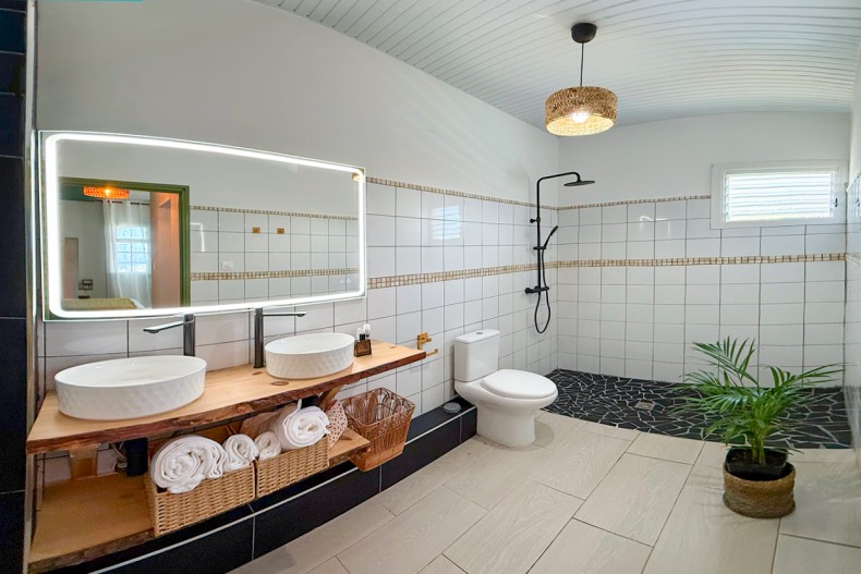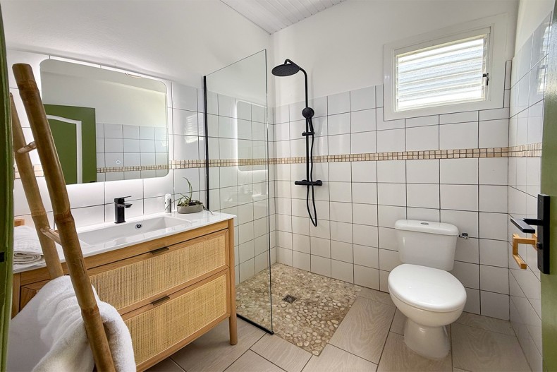 La suite dispose de sa salle d’eau avec douche à l’italienne, vasque et WC.