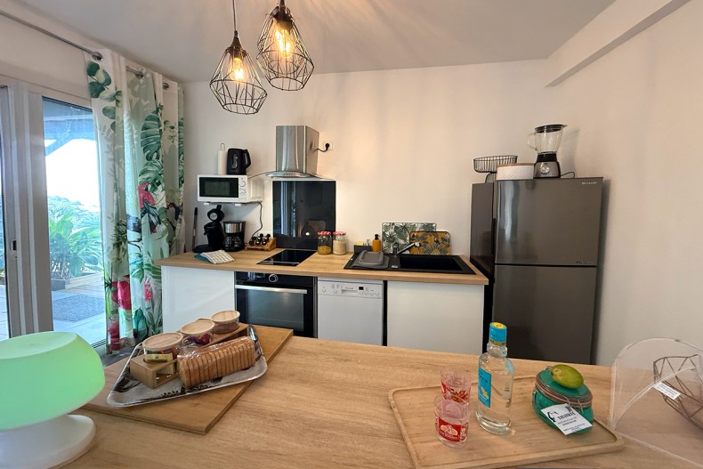 l'appartement VIE CREOLE est entièrement équipé et meublé pour vous offrir un séjour inoublialble. Vous aimerez séduit par son intérieur bien agencé, comprenant un bel espace de vie avec une cuisine ouverte équipée (lave-vaisselle, four, plaque vitrocéramique, hotte, réfrigérateur-congélateur, micro-ondes) et un salon confortable avec canapé, table basse, meuble TV et télévision.