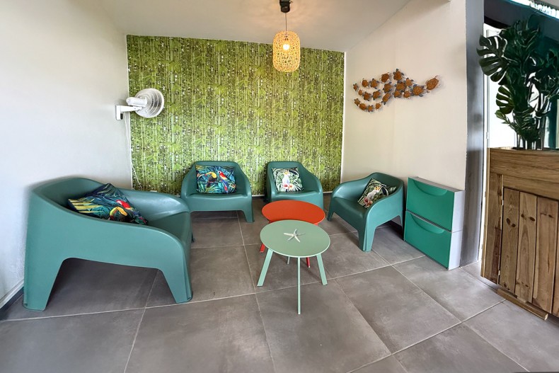 À l'extérieur, vous profiterez d'un espace couvert idéal pour savourer vos repas en toute tranquillité. Cet espace s'étend vers un salon extérieur accueillant, parfait pour vos moments de détente ou pour siroter des cocktails tropicaux.