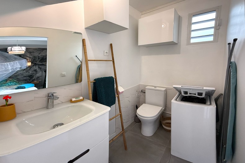 La chambre, décorée avec soin dans un style caribéen, est séparée de la cuisine par une verrière équipée d'un rideau. Elle dispose également d'une salle d'eau avec douche à l'italienne et WC.