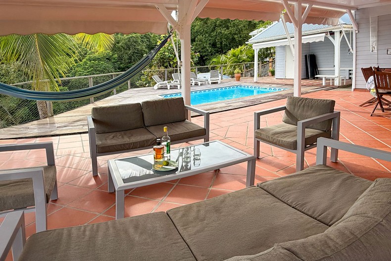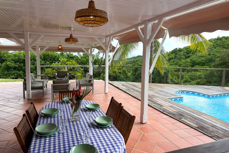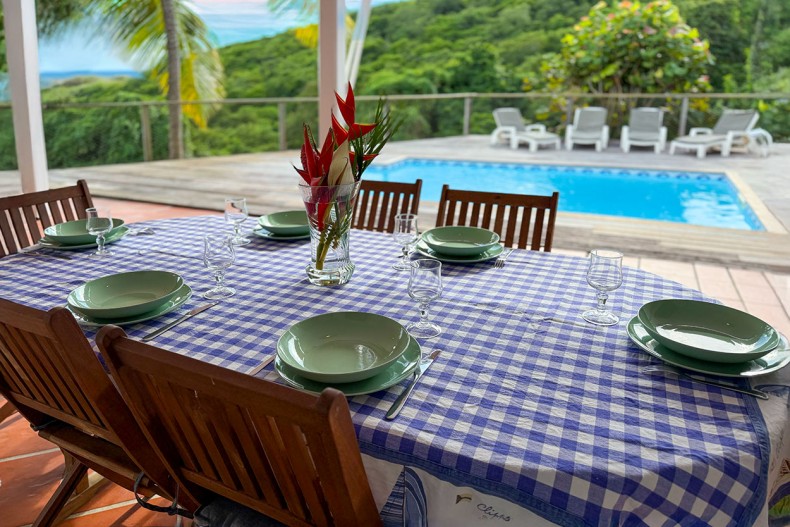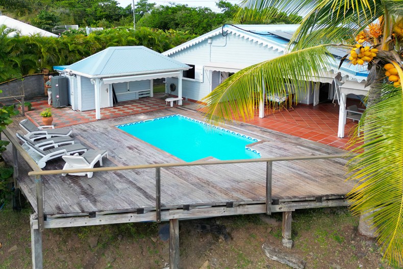 Vous pourrez vous rafraîchir dans la belle piscine où vous pouvez profiter de la vue mer face aux Ilet du Robert.