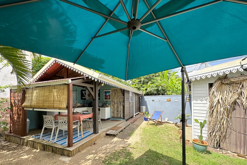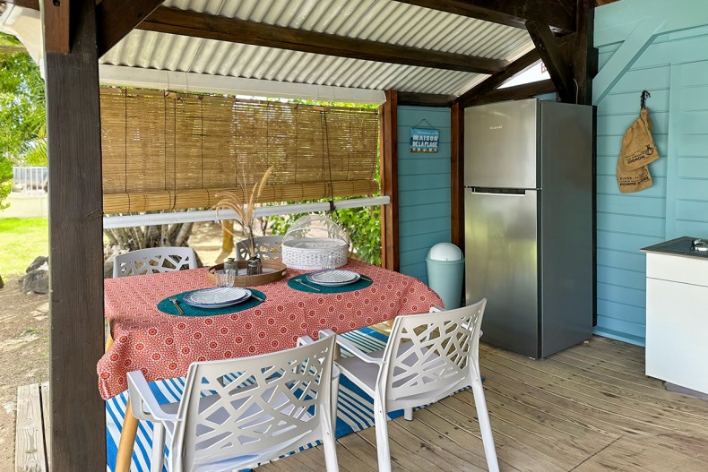 Le bungalow se trouve dans un petit jardin arboré, une terrasse abrite une cuisine toute neuve et fonctionnelle.