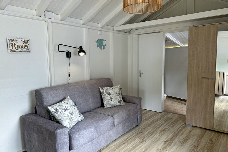 A l’intérieur un salon et son canapé convertible de qualité qui se transforme en lit de 160 confortable.