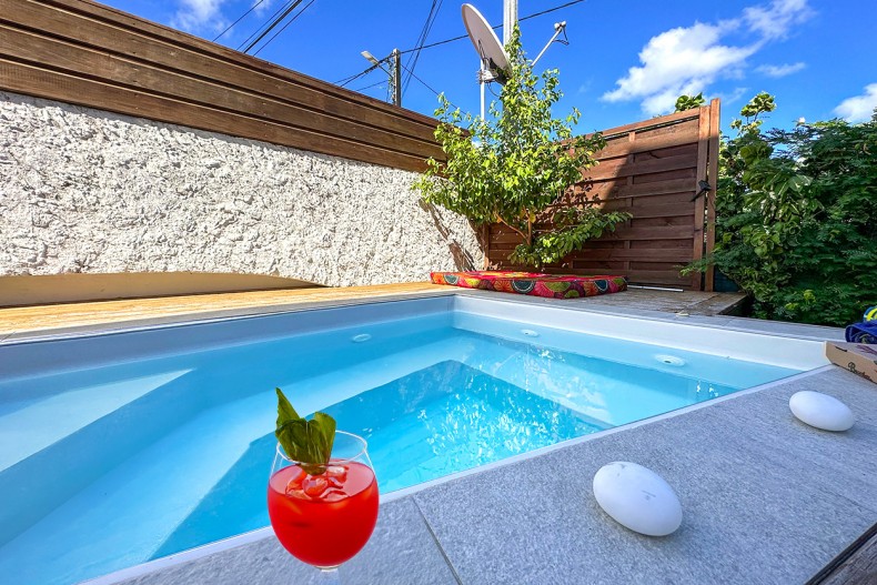 La petite oasis s'étend autour d'une mini mini piscine "Bac à punch", invitant les résidents à se rafraîchir sous le doux soleil des Caraïbes. Le logement, conçu pour accueillir jusqu'à deux personnes, dévoile ses 20 mètres carrés bien aménagés. Une terrasse baignée de lumière naturelle offre un espace extérieur propice à la détente, tandis qu'un coin cuisine équipée promet des repas délicieux à concocter.