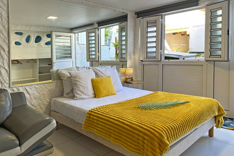 La chambre salon climatisé, assure des nuits paisibles après des journées enivrantes. Le linge de maison, délicatement fourni, ajoute une touche de confort à cette échappée tropicale.