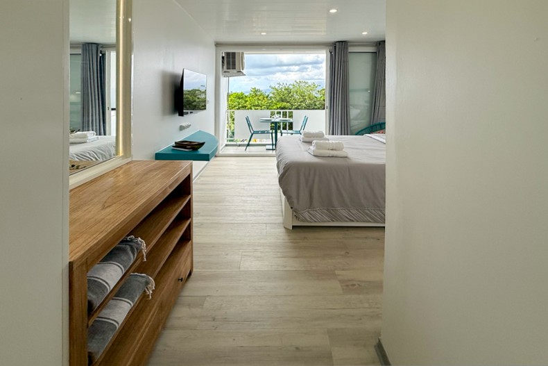 La chambre s’ouvre sur un balcon privé offrant une vue panoramique sur la baie, parfait pour apprécier un café le matin ou un coucher de soleil. Les grandes baies vitrées laissent entrer la lumière naturelle, tandis que des rideaux occultants assurent une parfaite intimité.