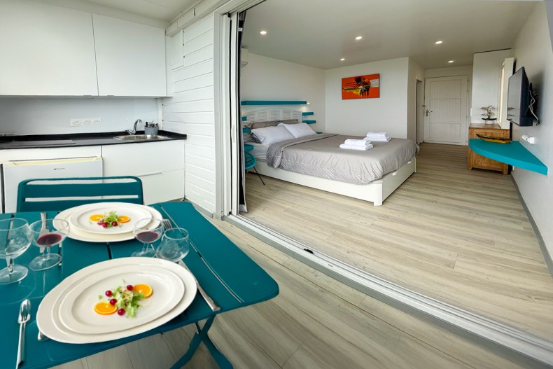 La Bay Room vous accueille dans un cadre élégant et apaisant à l’Anse Mitan. Cette chambre, conçue avec des matériaux haut de gamme et une touche cocooning, offre une vue imprenable sur la baie depuis un balcon privé. Chaque détail est pensé pour votre confort : Smart TV, Wi-Fi et rideaux occultants pour des nuits paisibles. La résidence propose également une piscine extérieure, idéale pour se détendre. Une adresse d’exception à deux pas de la plage, pour vivre la Martinique autrement.