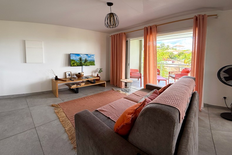 Où se situe la villa ? Sur les hauteurs des Trois-Îlets, proche du golf et des plages.