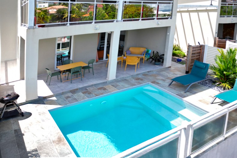En rez-de-jardin, l’ambiance est plus relax : terrasse ombragée, transats, salon extérieur et un bac à punch privatif de 4x3 m, idéal pour se rafraîchir ou se détendre.