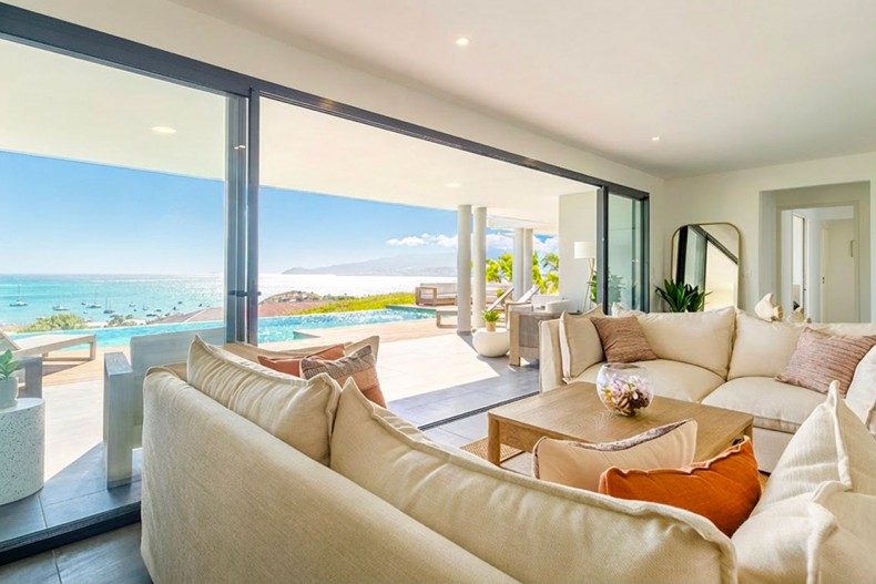 Une vaste pièce de réception baignée de lumière accueille un salon élégant, une cuisine de chef entièrement équipée et un espace repas ouvert sur l’extérieur. La salle à manger extérieure, idéalement orientée, vous invite à dîner face au coucher du soleil sur la mer des Caraïbes.
